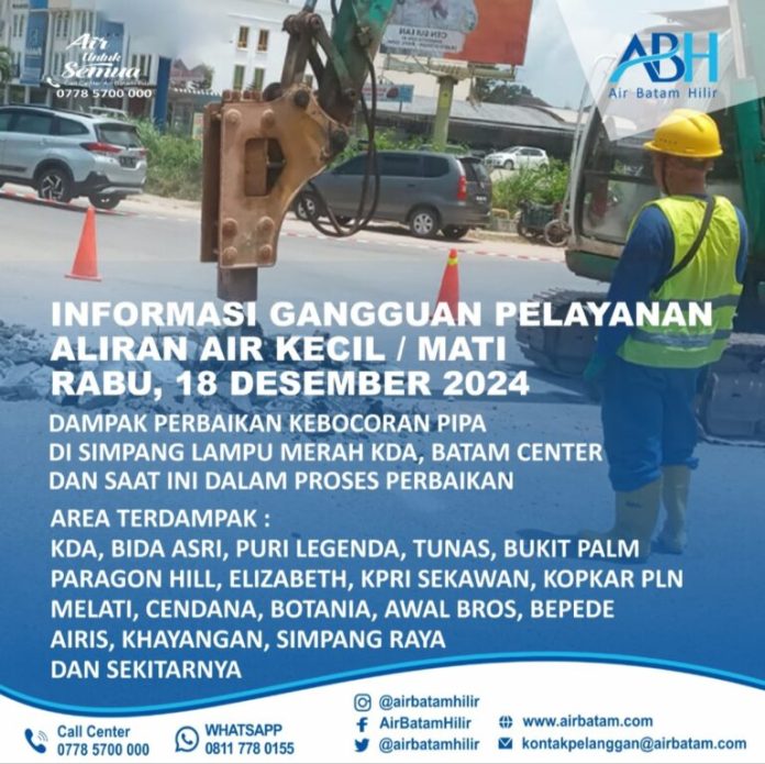 Batam, Suaraanalisa.com – PT. Air Batam Hilir menginformasikan, dampak pekerjaan terencana penyambungan pipa DN 150mm di Kavling Swadaya, Bengkong.