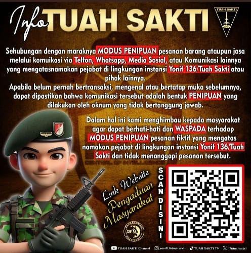 Seperti diketahui, modus penipuan pesanan fiktif yang mengatasnamakan Yonif 136/Tuah Sakti ini dilakukan oleh para pelaku yang tidak bertanggung jawab melalui via Telfon, WhatsApp, media sosial atau alat komunikasi lainnya.