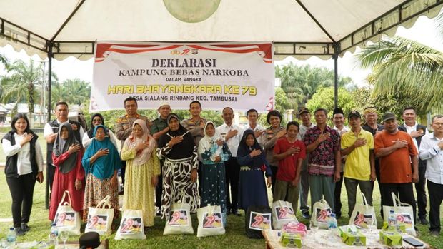 Deklarasi Kampung Bebas Narkoba di Kabupaten Rohul, Riau, diakhiri dengan pemberian sembako/ Foto: dok. Polres Rohul.