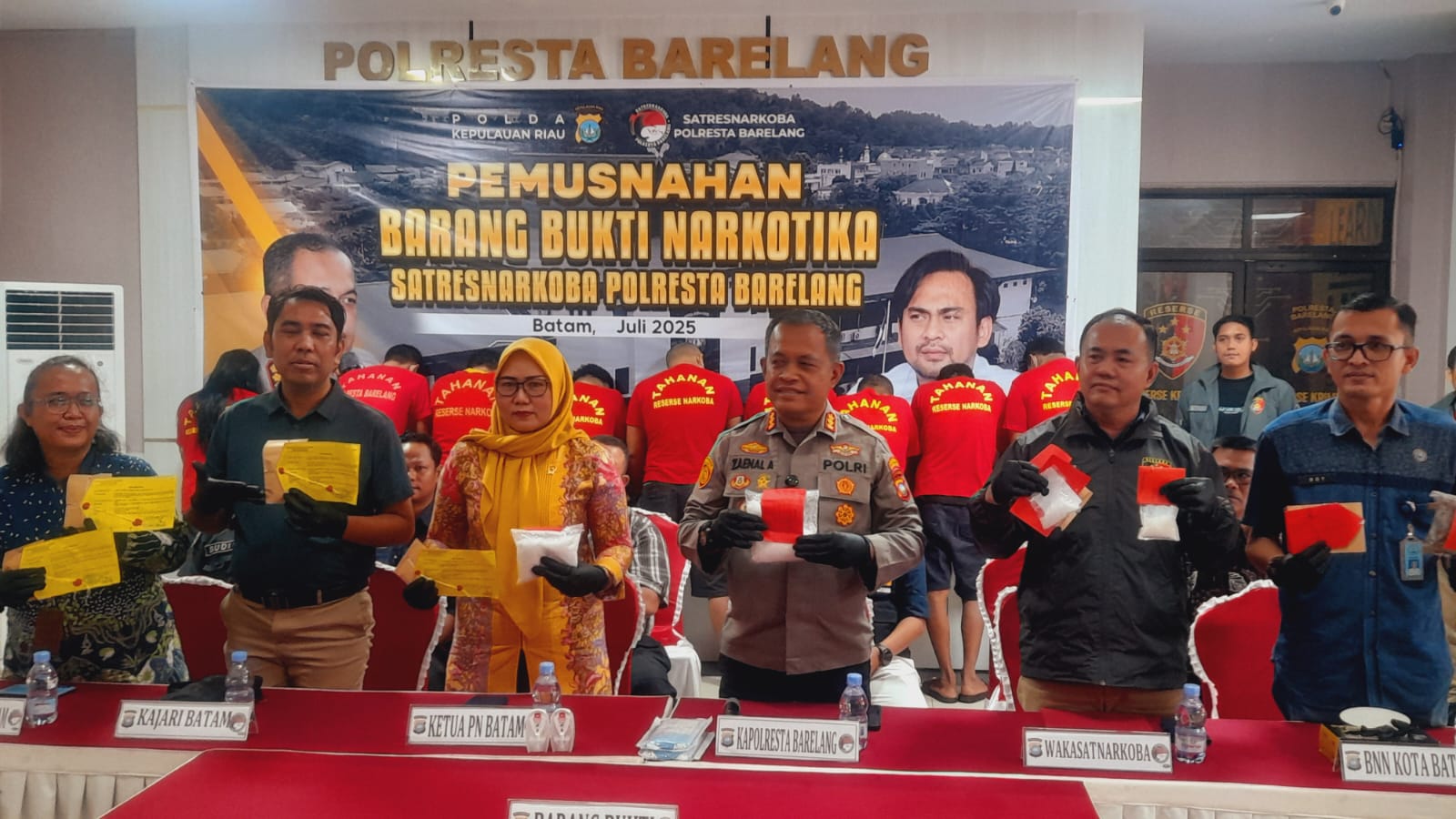 Pemusnahan barang bukti dipimpin langsung oleh Kapolresta Barelang, Kombes Pol Zaenal Arifin, S.I.K, dan dihadiri oleh perwakilan BPOM, Maya, Kepala Kantor Pelayanan Utama Bea dan Cukai Kota Batam yang diwakili oleh Kasi Penindakan, Ardian Ramerta, dan tamu undangan.