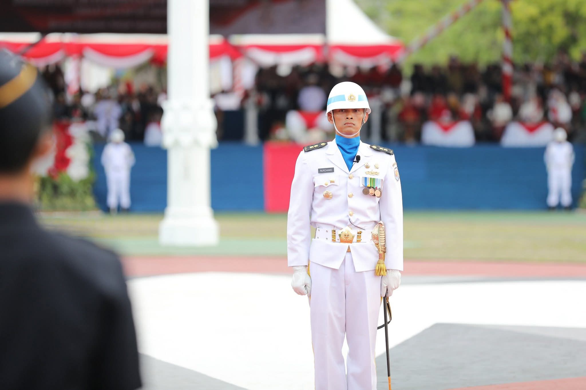 “Alhamdulillah, upacara penaikan Sang Merah Putih berjalan hikmat dan lancar. Saya terharu karena acaranya luar biasa. Semoga kerja keras panitia hingga akhir berjalan mulus. Cuaca hari ini juga mendukung, cerah sekali,” ujarnya usai upacara.